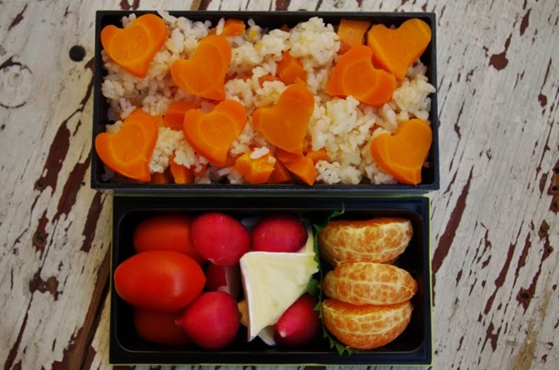 Kolejne bento z japońskim ryżem. Znowu bardzo prosto - podsmażony ryż na oliwie wymieszany ze słodką gotowaną marchewką. I kilka marchewkowych serduszek. :)